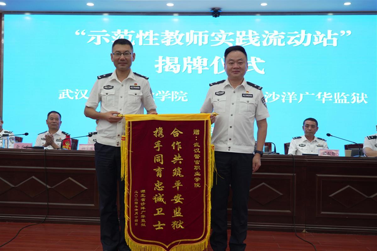 随后,校监双方举行揭牌仪式。杨明军监狱长代表沙洋广华监狱向武汉警官职业学院赠送锦旗。在此次活动中,该校党委书记、校长陈风华等相关人员参观了监狱罪犯习艺车间、监狱史展厅、教育成果展厅以及实习生基地。