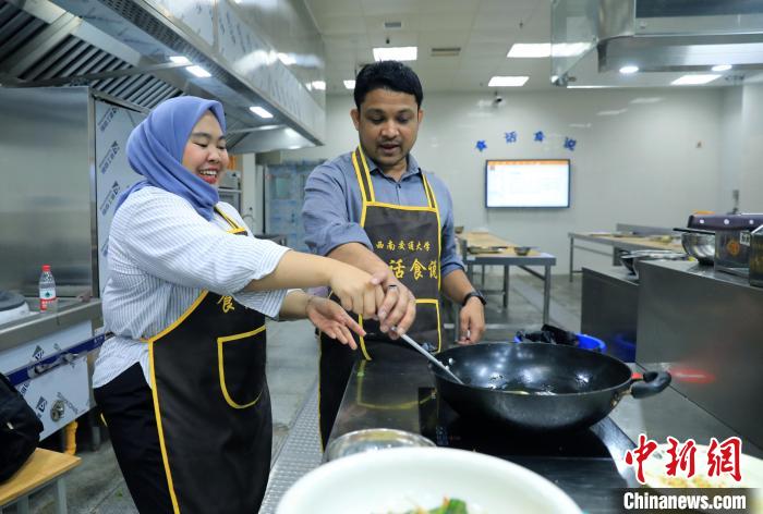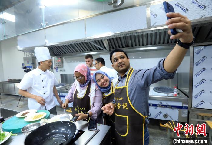 6月19日,四川成都,孟加拉国留学生哈琪(右一)在灶台前自拍。西南交通大学开设了一门饮食教育课程,课程共计32个课时,教授学生们烹饪理论及水煮鱼片、冷吃兔等12道经典川菜的烹饪方法,吸引了一些外国留学生参加学习。 中新社记者王磊摄