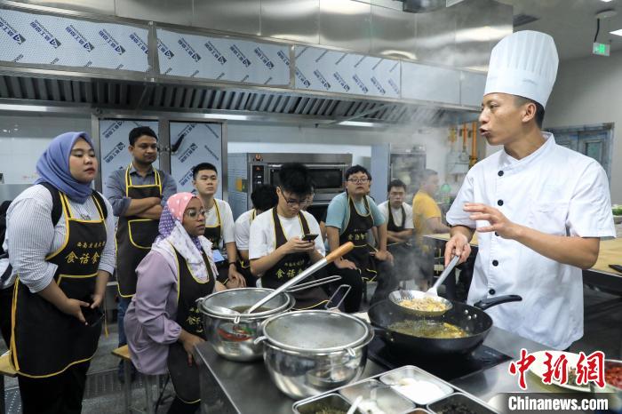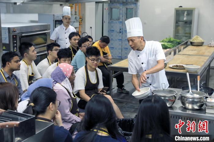 6月19日,四川成都,烹饪老师(右)给学生讲解川菜冷吃兔的烹饪方法。西南交通大学开设了一门饮食教育课程,课程共计32个课时,教授学生们烹饪理论及水煮鱼片、冷吃兔等12道经典川菜的烹饪方法,吸引了一些外国留学生参加学习。 中新社记者王磊摄