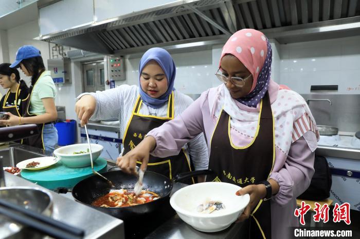 6月19日,四川成都,孟加拉国留学生哈琪(右)和印度尼西亚留学生何萨玛正在学做川菜冷吃兔。西南交通大学开设了一门饮食教育课程,课程共计32个课时,教授学生们烹饪理论及水煮鱼片、冷吃兔等12道经典川菜的烹饪方法,吸引了一些外国留学生参加学习。 中新社记者王磊摄