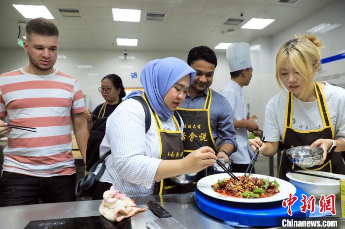 6月19日,四川成都,印度尼西亚留学生何萨玛(左二)正在品尝老师做好的冷吃兔。西南交通大学开设了一门饮食教育课程,课程共计32个课时,教授学生们烹饪理论及水煮鱼片、冷吃兔等12道经典川菜的烹饪方法,吸引了一些外国留学生参加学习。 中新社记者王磊摄