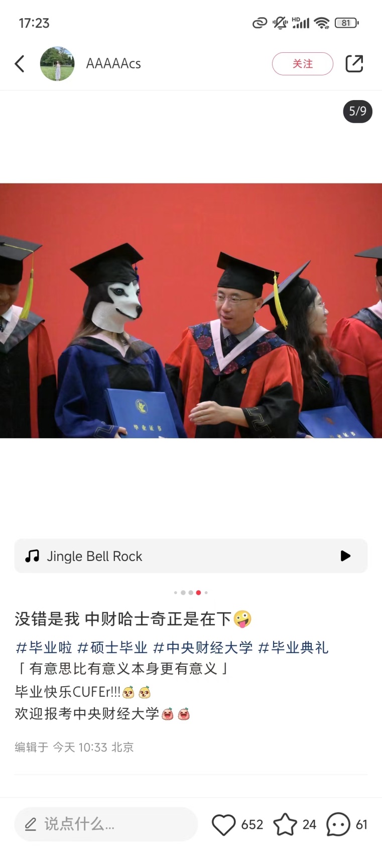 无独有偶,在中央财经大学的毕业典礼上,也出现了一位coser,不过她cos的是一只哈士奇。这位网名是@AAAAcs 的女硕士,戴上了一个哈士奇头套参与毕业典礼。拨穗的导师虽然满脸震惊,还是保持了优雅的风度为这位弟子拨穗。