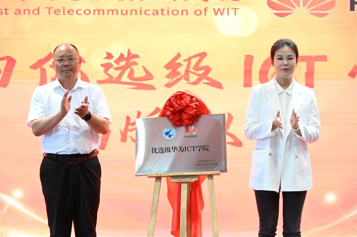 冯兵(左)和华为公司相关负责人辛雨在华为ICT学院授牌仪式上