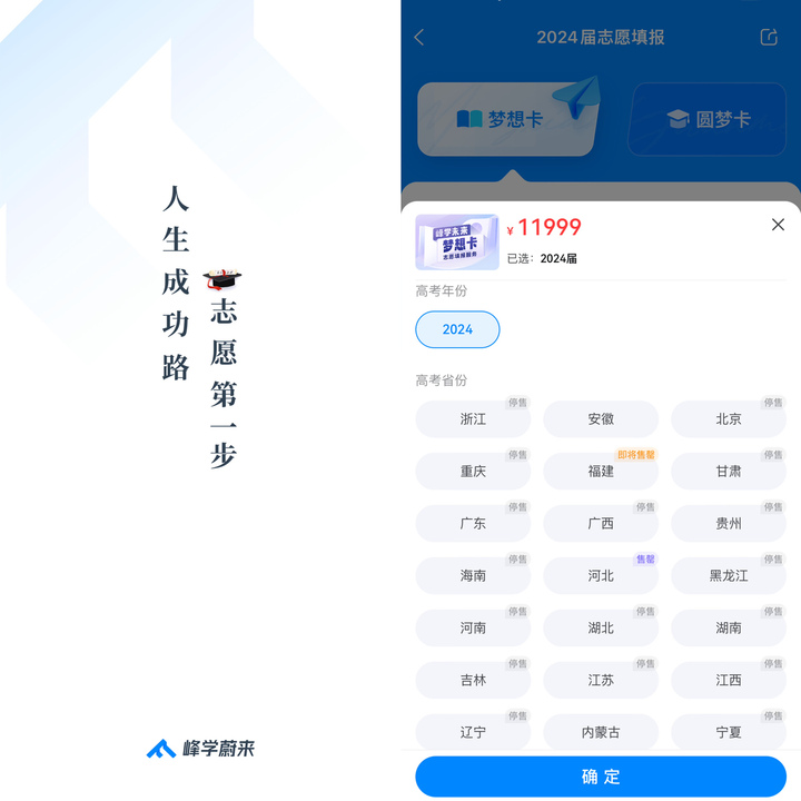 比如,考研名师张雪峰创立的“峰学蔚来”,以“人生成功路,志愿第一步”为口号,尽管其高考志愿填报服务的价格高达上万元,但家长们报名的热情依旧不减。其价格为11999元的2024届志愿填报“梦想卡”,在浙江、北京、重庆等大部分地区均已售罄,且福建、四川、云南等地也显示“即将售罄”。不少购买的家长表示,其高考志愿填报服务需要蹲点“抢”,不久前推出的2026年填报服务名额就已售罄。