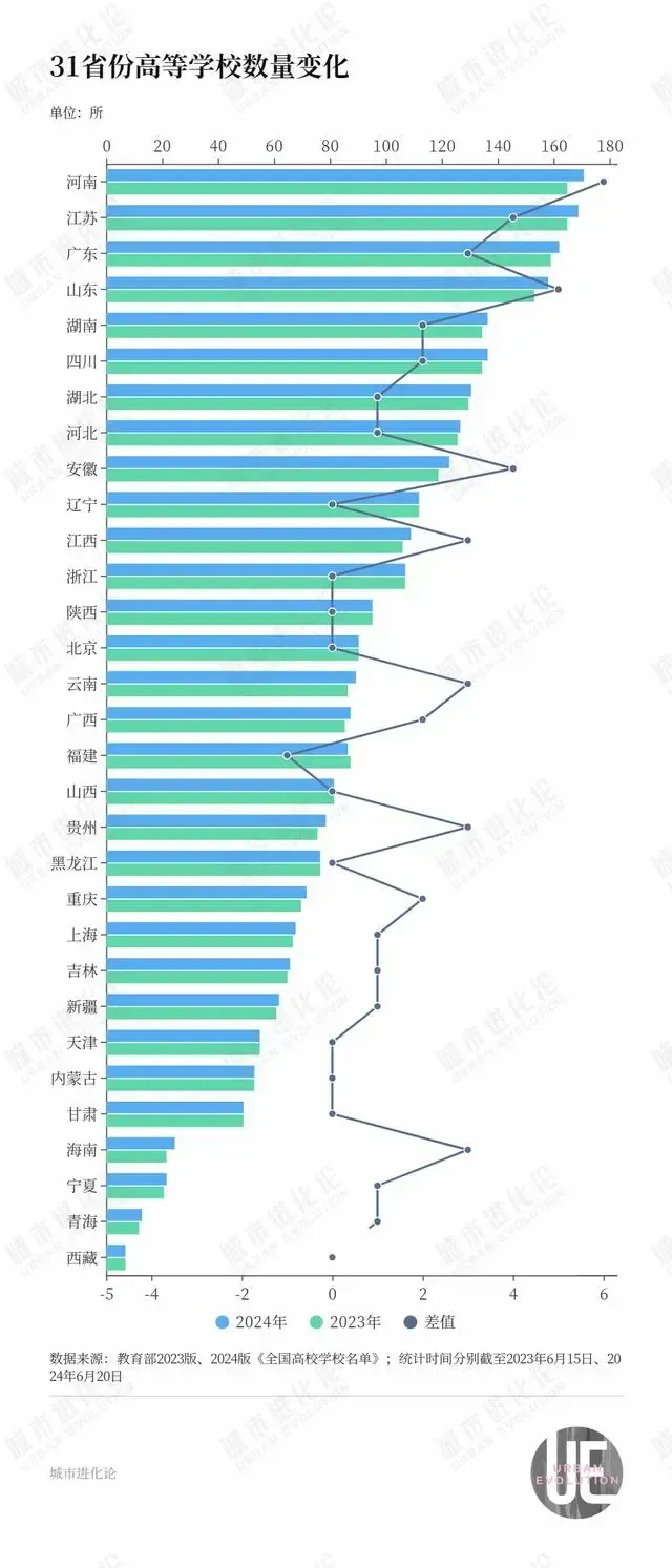 对比2022-2023的高校增长情况来看,彼时全国普通高校新增61所,本科学校数量缩减(-5所),高职(专科)院校实现大幅增长(+66所)。而到了今年,普通高校中本科学校的数量确实有了明显的增加。