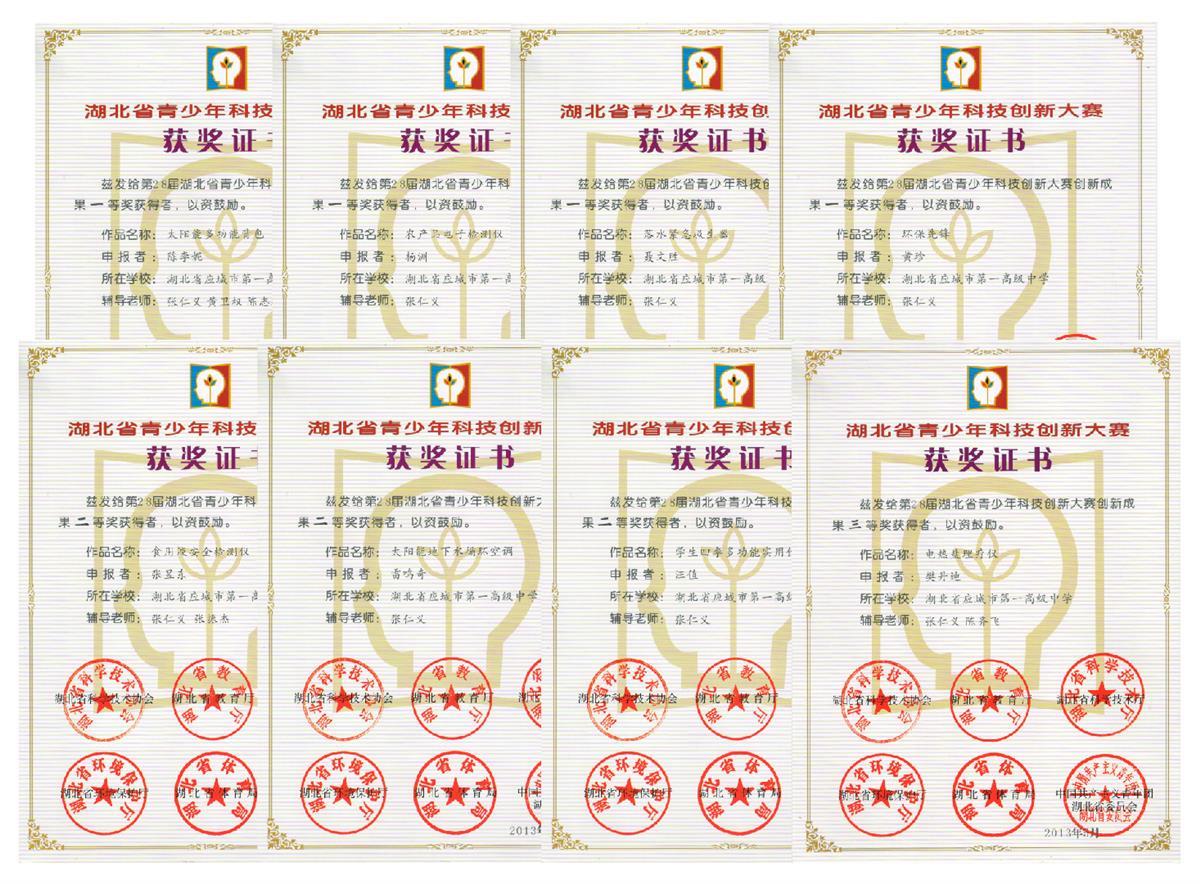 在全国“青科赛”大赛中的集体项目中,节能健康饮水机荣获全国二等奖,另外12件作品均荣获省一等奖;在全国NOC发明创新大赛中,教师作品:色光引诱飞虫捕灭器、废旧酒瓶盖验证大气压强演示器均荣获全国特等奖;学生作品:三维电子水平测量尺、安全防风伞均荣获全国特等奖。在全国NOC大赛中荣获全国一等奖29项,连续五年夺得冠军。在全国自制教具比赛中,我校有4件作品均荣获全国二等奖,获省一等奖7项。在宋庆龄全国少年儿童发明奖励活动中,我校学生获一银一铜的好成绩。在全国发明创意大赛中,应城一中科技创新团队荣获15金牌、19银牌、16铜牌,在第5届、第6届团队总分均居全国第二名。在2015年湖北省“五小”竞赛活动中:我校科技创新团队荣获省一等奖15项,省二等奖7项,省三等奖6项。