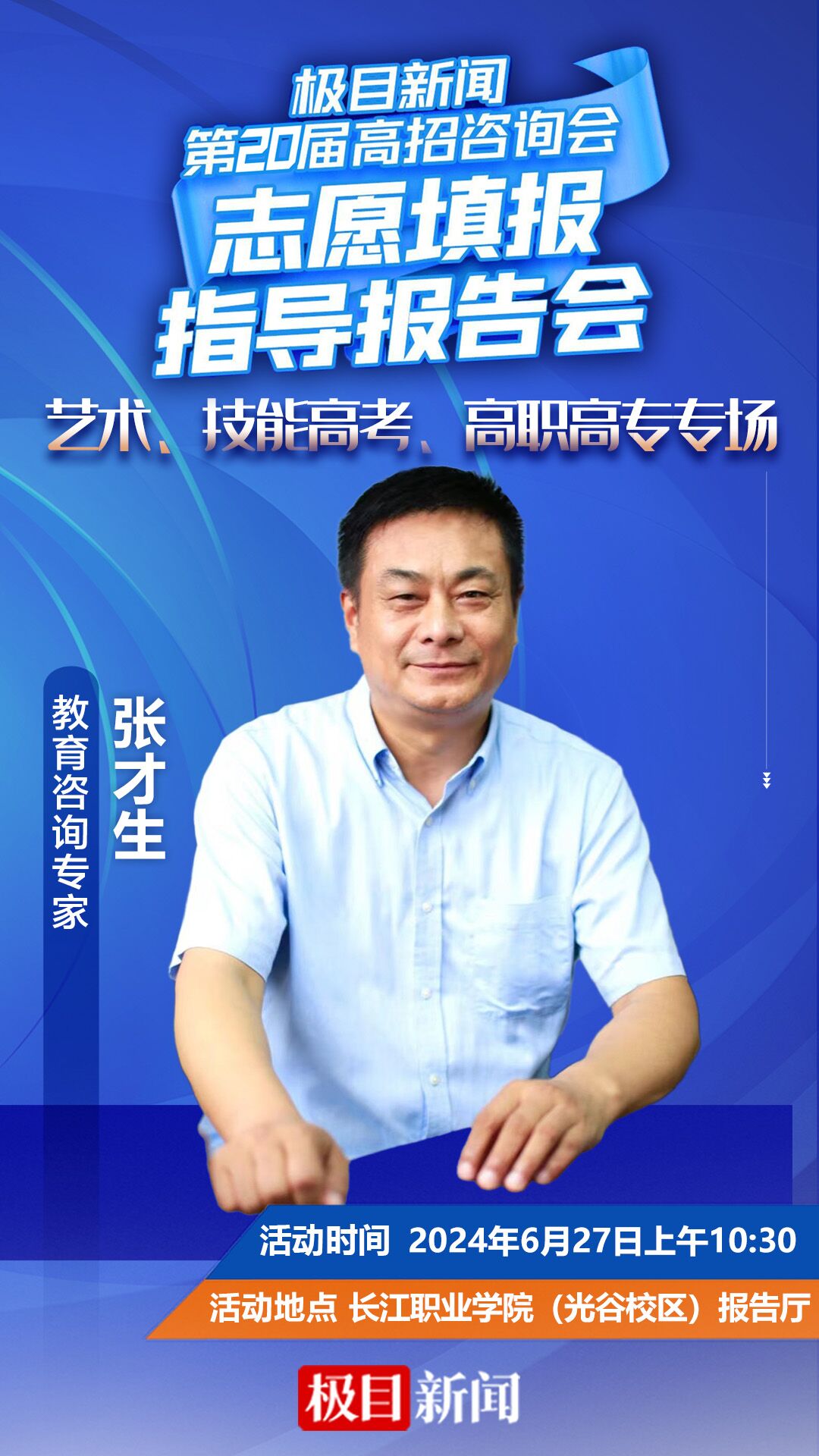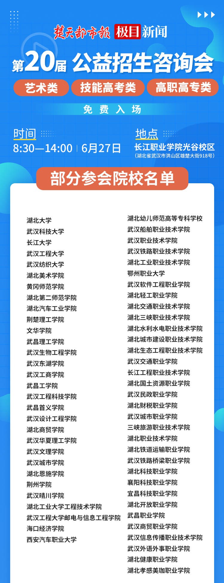 今早,湖北高考放榜啦!考得好还要填得好,带上你的高考成绩单,6月27日上午8时,来长江职院光谷校区,参加由楚天都市报极目新闻举办的艺术类、技能高考类、高职高专类专场高招咨询会。