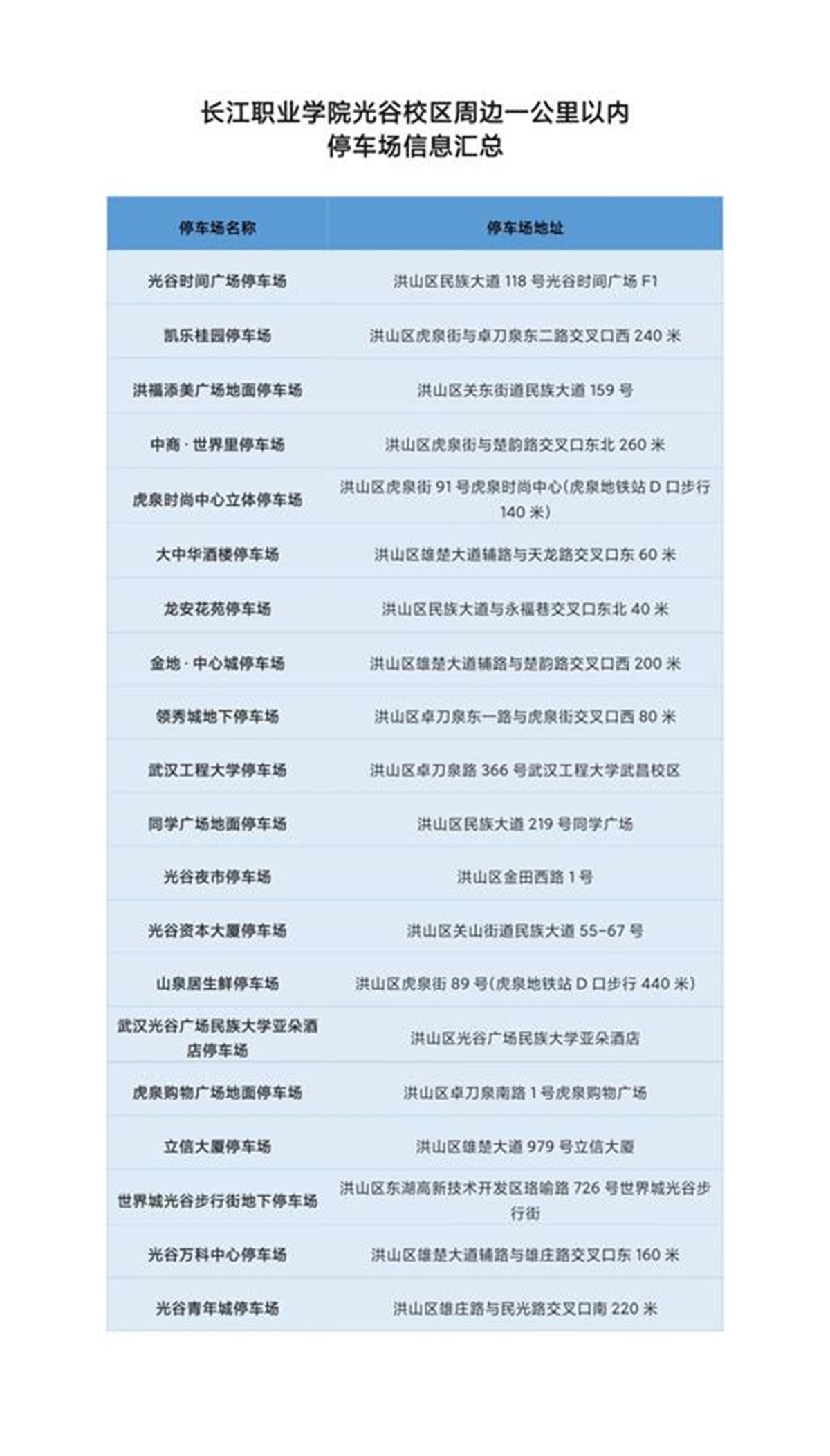 乘坐轨道交通2号线至光谷广场C出口,步行约1公里到长江职业学院光谷校区;或在民族大道光谷广场公交站转乘538路、590路、583路、572路、810路公共汽车至民族大道时间广场站下车。