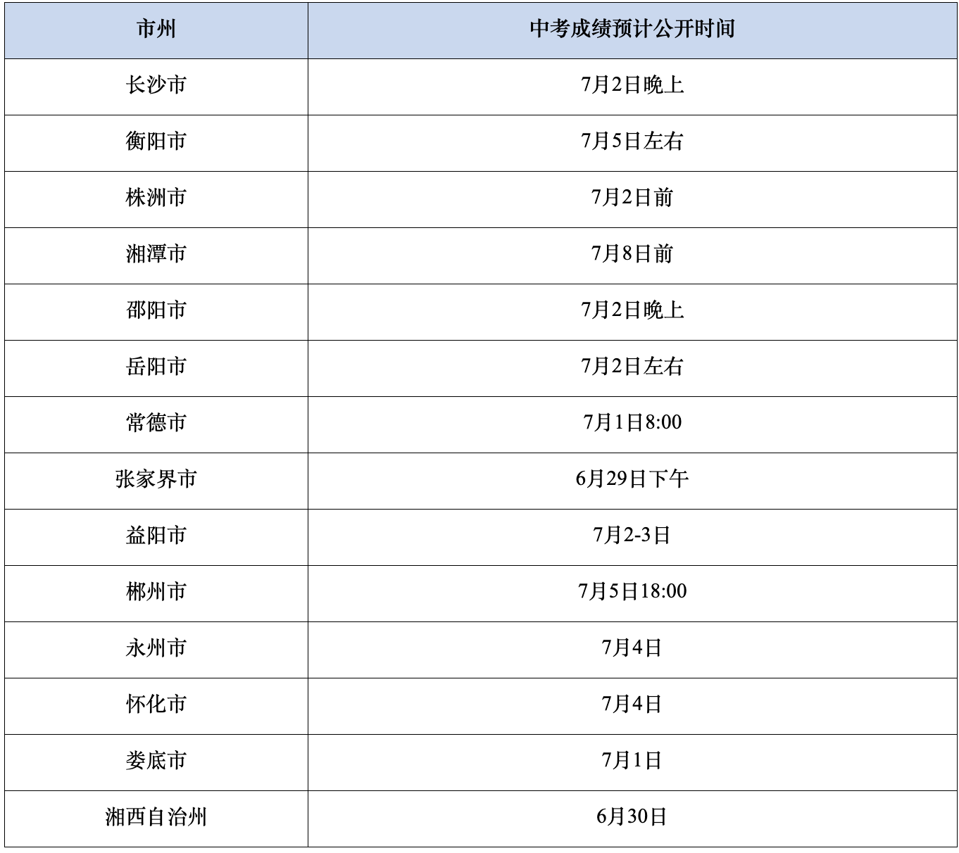 注:表格中的时间为各市州中考成绩预计公布时间,具体时间请以各市州教育局最新通知为准。