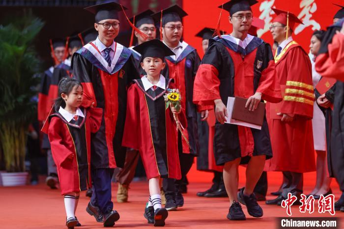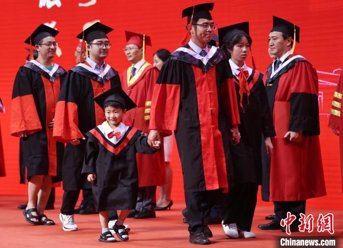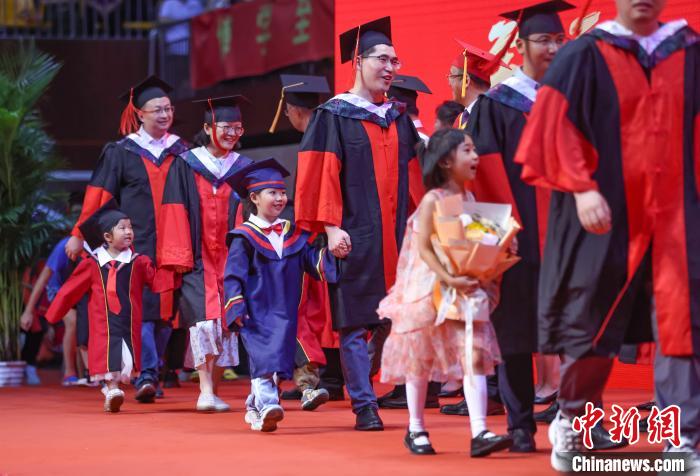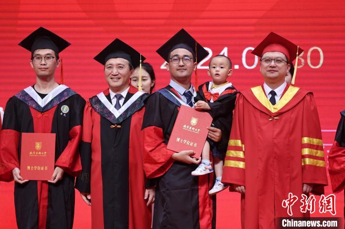 6月30日,南京医科大学2024届研究生毕业典礼暨学位授予仪式举行,在学位授予仪式环节,不少博士生带着自己的孩子上场,让孩子一同见证自己的“高光时刻”,再现博士生登台“名场面”。据了解,该校今年共有2156名硕士生、299名博士生圆满完成学业,告别校园启新程。 中新社 记者 泱波 摄