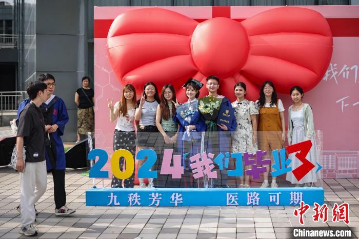 6月30日,江苏南京,毕业生和他们的朋友拍摄合影。当日,南京医科大学2024届研究生毕业典礼暨学位授予仪式举行,2156名硕士生、299名博士生圆满完成学业,告别校园启新程。 中新社 记者 泱波 摄