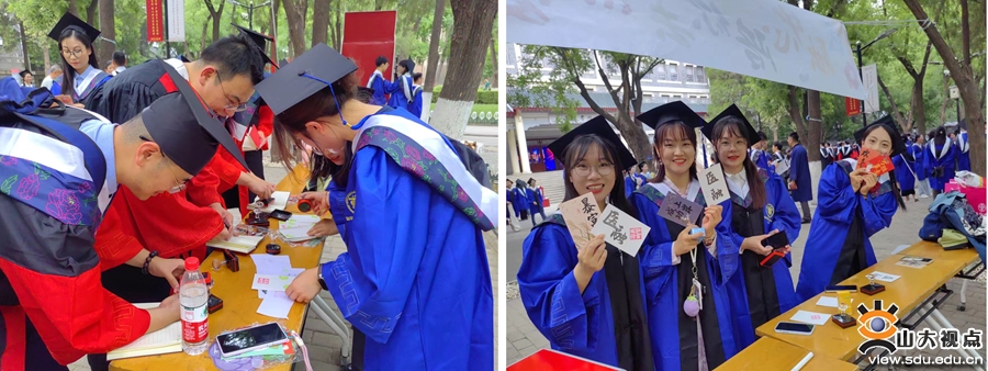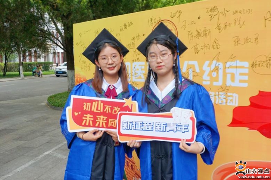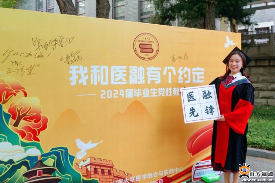 近日,山东大学医学融合与实践中心党总支在趵突泉校区综合楼南侧广场举行“我与医融有个约定”2024届毕业生党性教育活动。活动设置签名合影文化墙和多款合影标语道具,众多应届毕业生积极参与,现场气氛热烈。镜头里,毕业生们身着学士服,纷纷结伴同窗好友一同在文化墙上留下自己的祝福与签名,并与这充满纪念意义的签名墙合影留念,捕捉定格下这欢声笑语的美好瞬间,深刻铭记下与“医融”的难忘约定。