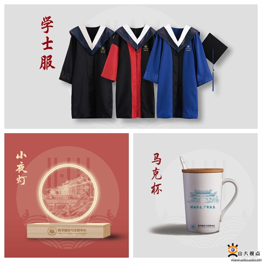 为全体2024届毕业生定制医融青年专属毕业礼包。一是精心设计专属学位服,学位服左胸位置印有医学融合与实践中心院标及毕业生姓名,寓意“你是医融中心独一无二的存在”;二是创新定制专属小夜灯,一盏“小夜灯”,寄托着医融全体教职工的美好祝福和殷切期盼,希望毕业生在即将开启人生新篇章之际,以奋斗姿态激昂青春,不负时代,不负年华;三是特色制作印有齐鲁医学精神的马克杯,“一杯子,一辈子”,希望毕业生能谨记师长教诲,不忘学医初心,在未来的人生路上永持博施济众初心,常怀广智求真情怀。