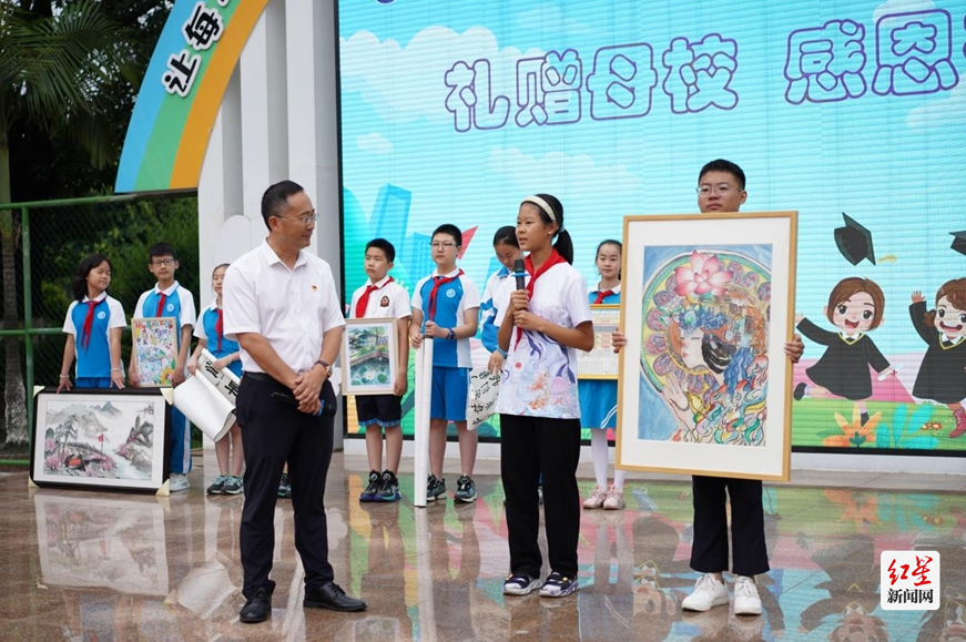 在毕业典礼上,同学们穿着她绘制的衣服在台上尽情展示,其中一位小同学身上穿着的具有羌族服饰元素的花纹尤其耀眼,是李治菲同学根据学校的藏羌艺术指引,结合着现代礼服特点设计创作的,非常有特色。这也是学校对藏羌文化艺术研究和传承的果实。毕业典礼上,李治菲向学校赠送了作品《祈愿的藏族少女》,丰富的色彩寓意着学校多姿多彩的办学特点,也同时为学校和同学们的未来送上祝福。