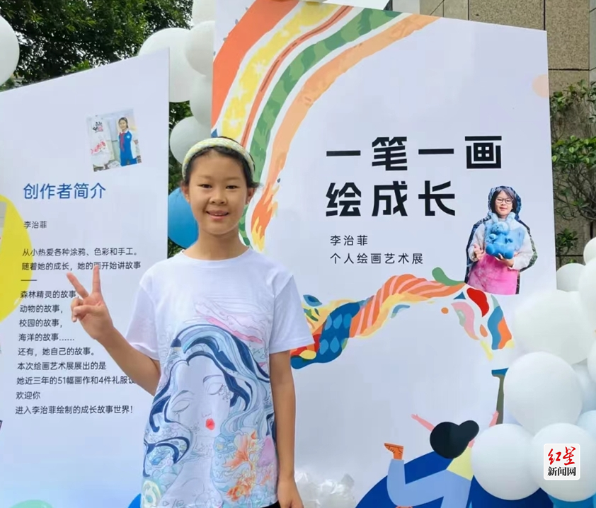 当天,学校还专门开放了绘画展区给李治菲同学的亲友团以及幼儿园母校的学弟学妹们,让他们共同见证她的成长果实。李治菲同学在现场向大家介绍着每幅画,讲述着画作里面的每个故事,大家听得津津有味。她班级的老师和同学都穿着印制有画作的文化衫,一看就知道他们对李治菲画作有多喜爱。听班主任冯好介绍,班级里有挺多李治菲的画作粉,大家都很期待这次的画展。她和老师们都非常支持李治菲的课余创作,帮助她平衡学习和爱好,允许作为毕业班孩子的她每周请假两次去画室。