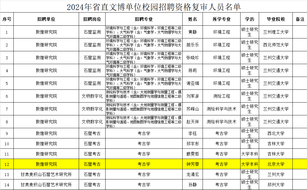 在敦煌研究院官网上,有一份6月28日发布的《关于2024年省直文博单位校园招聘资格复审及面试的通知》。复试名单显示北大考古学专业本科毕业生钟芳蓉应聘了敦煌研究院的石窟考古岗位。该项校园招聘的资格复审安排时间为7月5日,报考敦煌研究院等的考生面试时间为7月6日。