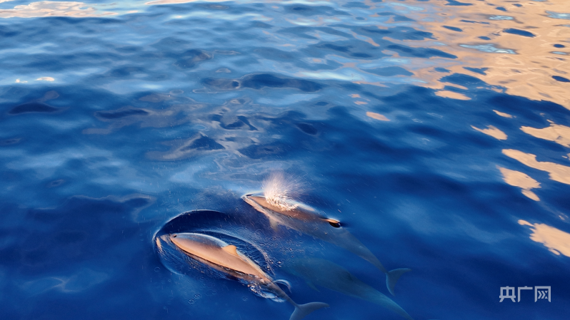 李松海赶忙走出房间,确定是海豚群后,大副边敲大家的房门边喊:“有海豚,快起床!”当大家睡眼惺忪走到甲板上,瞬间被眼前的一幕所震撼,朝阳映照在海面,好几群海豚在船头游动,露出水面呼吸的声音清晰可听见。