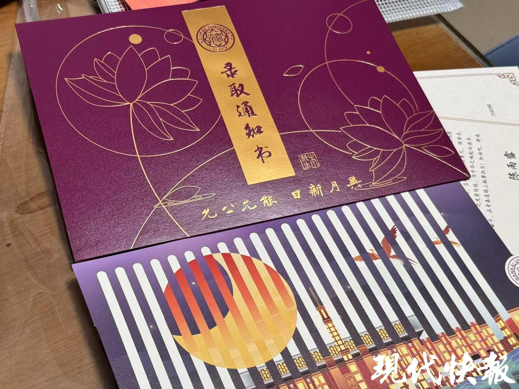 现代快报记者了解到,陈翔宇同学高中就读于江苏省苏州一中,今年高考以626分的成绩通过强基计划,被南开大学历史系(本硕博连读)录取。收到通知书后,他第一时间拆开了这份“喜报”:紫色烫金的录取通知书、致新生的一封信、来自周总理故居的莲花种子……精致走心的“新生礼”饱含了殷殷嘱托,蕴藏无限希望。陈翔宇表示,之前已在网上平台查到被录取的消息,自己对历史有浓厚兴趣,希望在历史研究方面走得更深入,踏踏实实走好学术研究之路。