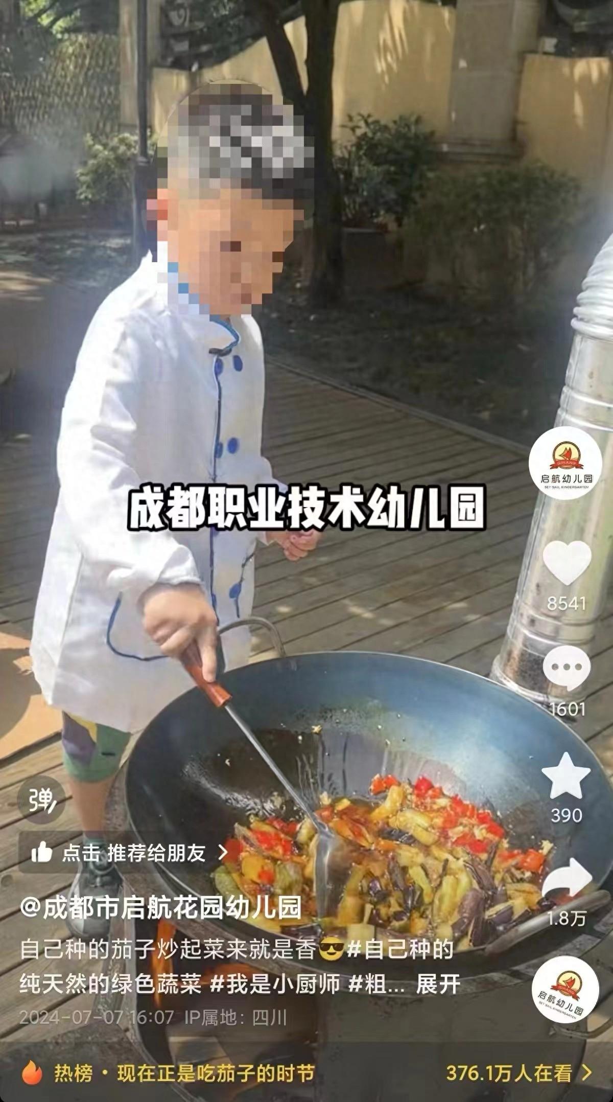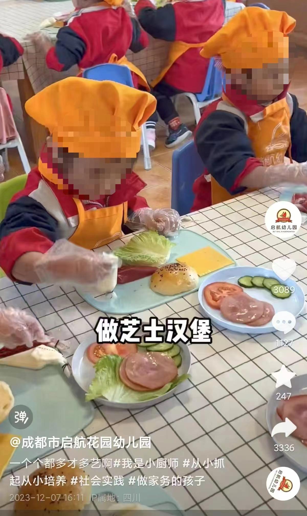 近日,位于成都市郫都区的成都市启航花园幼儿园(以下简称“启航花园幼儿园”)在社交媒体上火了,被网友戏称为“职业技术幼儿园”。幼儿园发布的短视频中,孩子们戴上厨师帽、穿上围裙,洗菜做饭、喂鸡养兔,甚至刺绣编织,稚嫩的面庞与熟练的动作形成鲜明对比,俨然“小大人”模样。不少网友评论:“孩子的手艺,可以直接出摊了。”