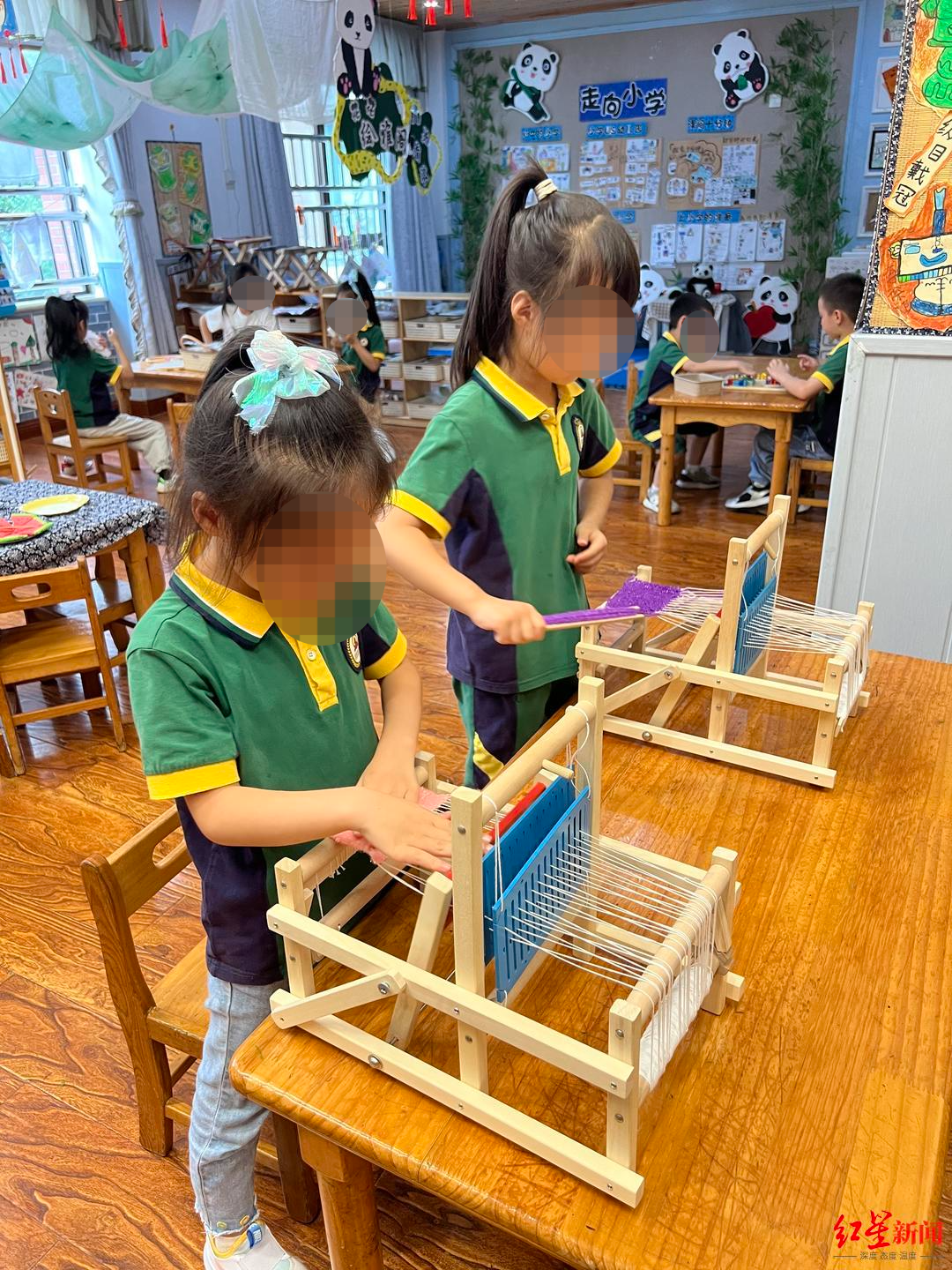 “自给自足”在幼儿园中成为可能。记者看到,园内设置了种植角、烹饪区、编织区等。孩子们坐在“工作室”中,熟练操作织布机,用梭子将毛线在经线之间交错结合,编织成温暖的围巾;想吃茄子了,就来到户外踩着泥巴钻到自己的“一亩三分地”里采摘,配上隔壁班级种植的小葱和辣椒,炒一道鱼香茄子;高难度的蒜香小龙虾也不在话下,堆柴烧火、食材清洗、捣蒜切葱、轮流掌勺,孩子们分工合作、轻车熟路地完成美食。