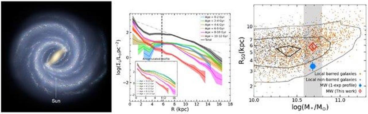 文章第一作者、云南大学中国西南天文研究所副教授连建辉介绍,基于新的恒星面密度分布,研究团队发现银河系半光半径(包含星系总光度一半的半径)几乎是之前估计的两倍(约1.9万光年),并和近邻同质量星系的半径基本一致,表明银河系在星系大小方面是一个典型的盘星系。