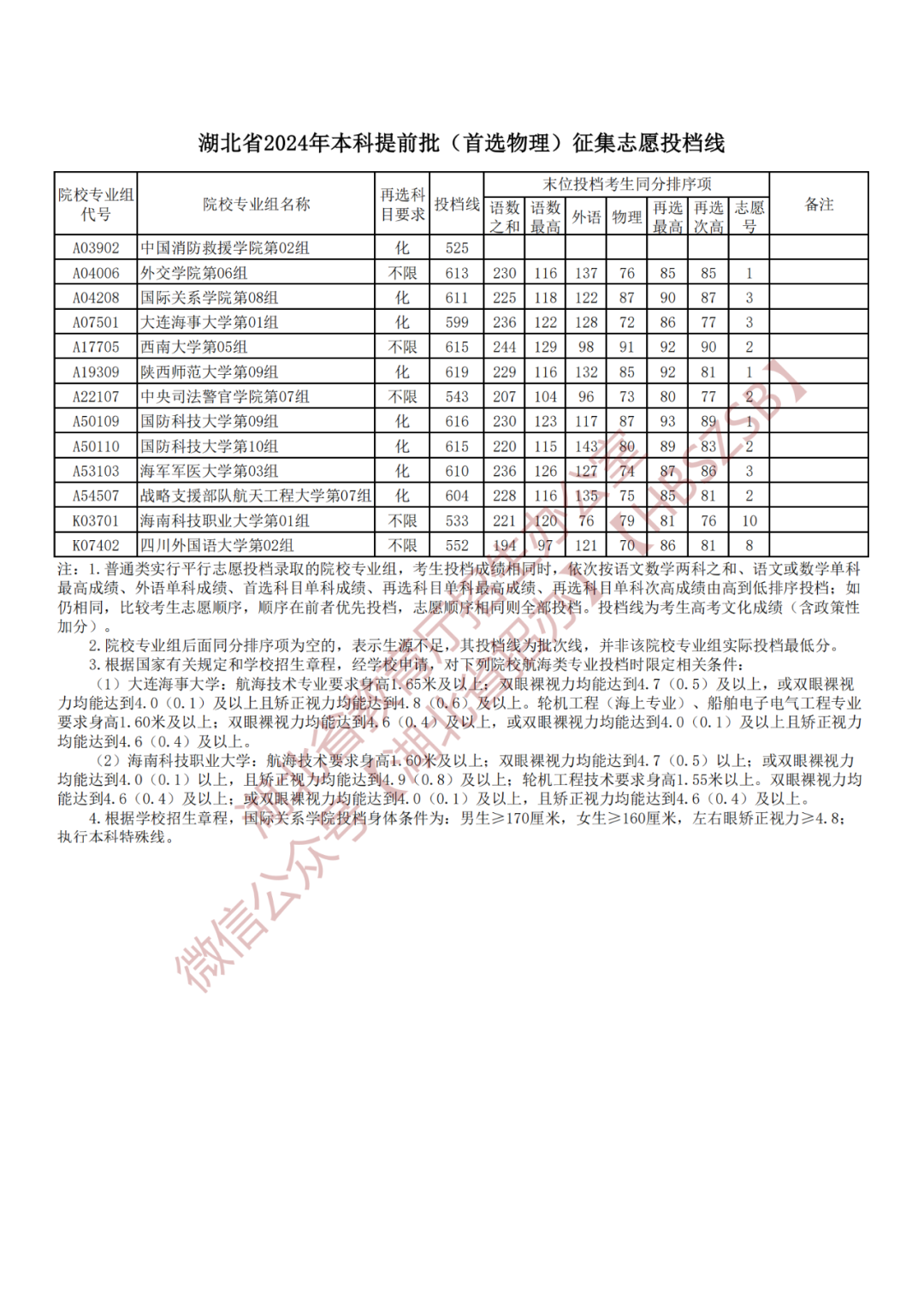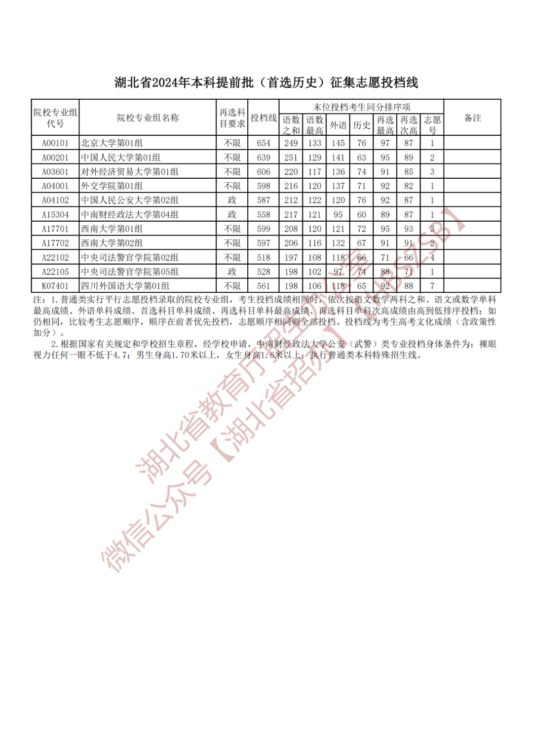 湖北省2024年本科提前批征集志愿投档线