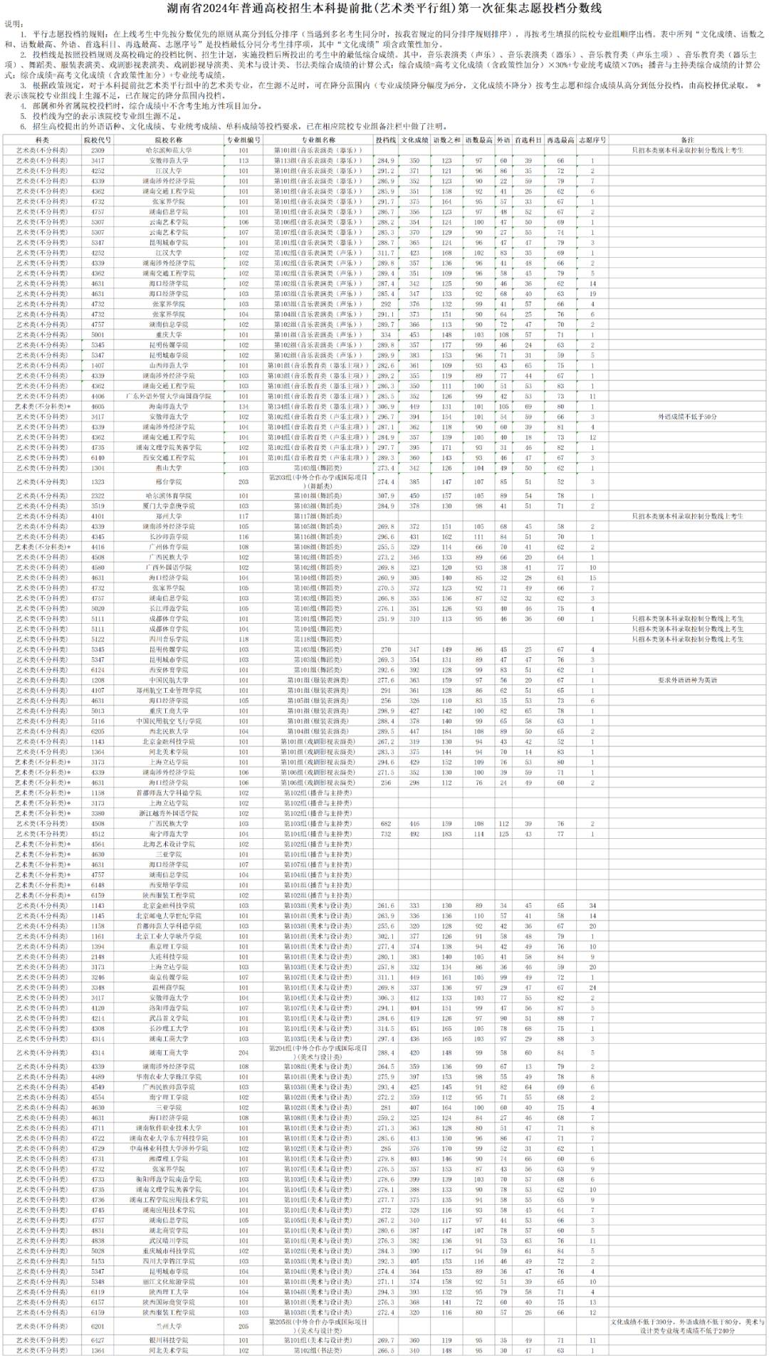 湖南公布2024年普通高校招生本科提前批(艺术类平行组)第一次征集志愿投档分数线