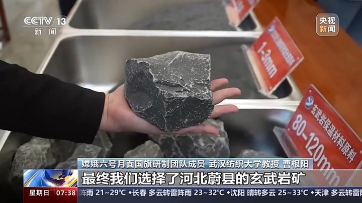 嫦娥六号月面国旗研制团队成员 武汉纺织大学教授 曹根阳:我们通过公开研究月壤的文献,发现月球上玄武岩的组分是很复杂的,有一二十种成分,最主要的是二氧化硅。我们就去匹配,对石头进行了分析,发现它的数据和月壤的成分非常接近。最终,我们选择了河北蔚县的玄武岩矿。