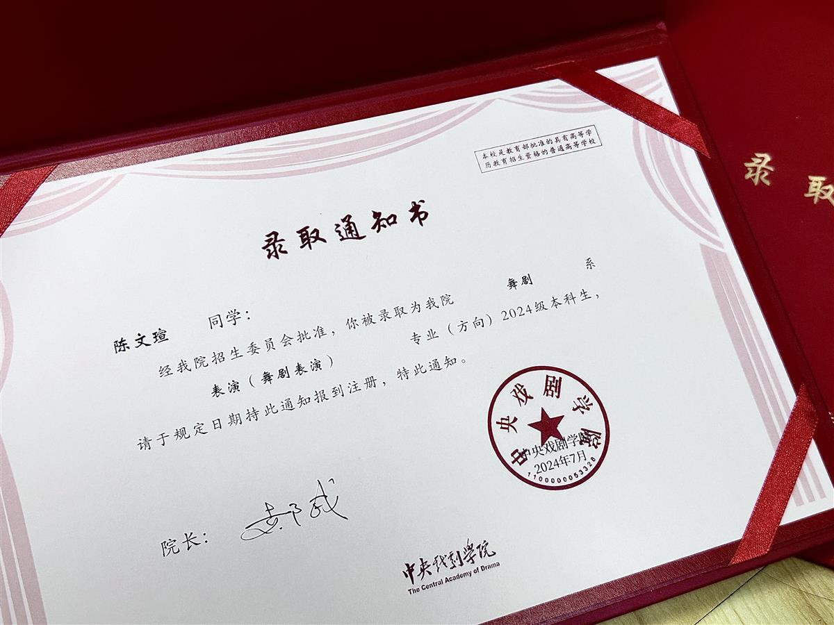 贾骐阁的同班同学陈文瑄从3岁开始接触舞蹈,她在今年的湖北省舞蹈艺术类专业统考中取得了280.7分,成绩格外突出,排名全省女生第二。参加国内多所艺术类院校专业校考的她,最终被中央戏剧学院舞剧表演专业顺利录取。