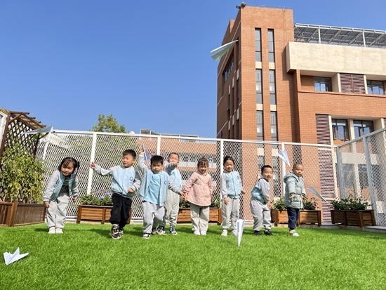 在九祥岭幼儿园新拓展的户外平台上,孩子们在放纸飞机。受访者供图