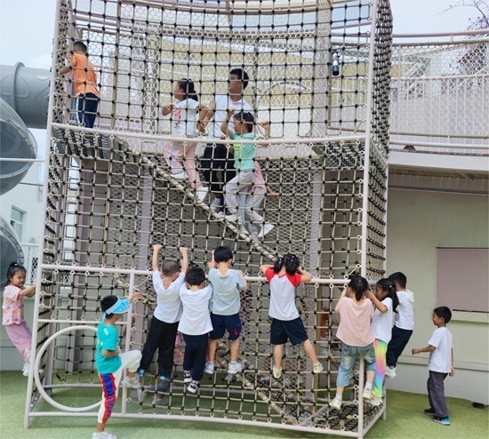 她解释,幼儿园的孩子跑跳蹦爬比较多,上肢锻炼不足,把绳索类器械揉入建筑里,让孩子在探索校园的同时,弥补上肢运动不足。