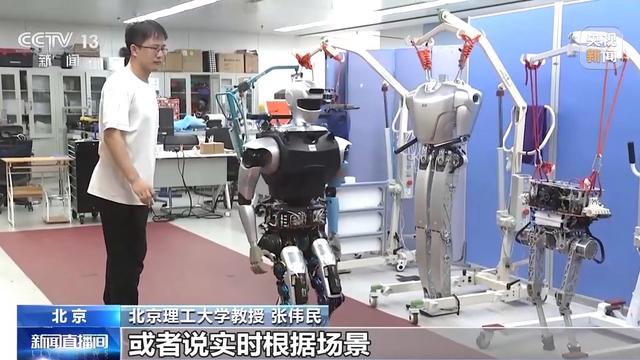 北京理工大学教授 张伟民:连续跑跳,它要腾空,稳定落地,现在一些动作也实现了,就实验室而言的话,主要是做探索,更复杂的场景下,或者实时根据场景决定究竟调哪个动作,真正实现像人或者像动物的一些行为。