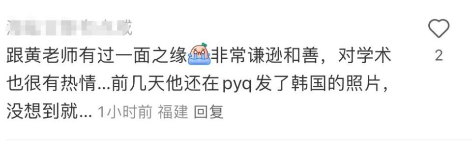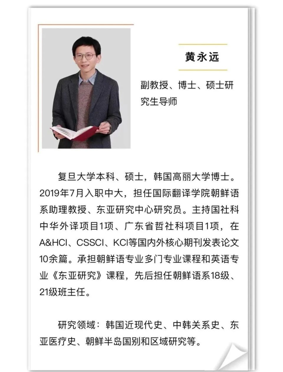 公开资料显示,黄永远副教授的研究方向为朝鲜半岛近现代史、中韩关系史、朝鲜半岛国别和区域研究,在其生前曾公开发表过近十篇论文、从事翻译工作、参与过多项课题。