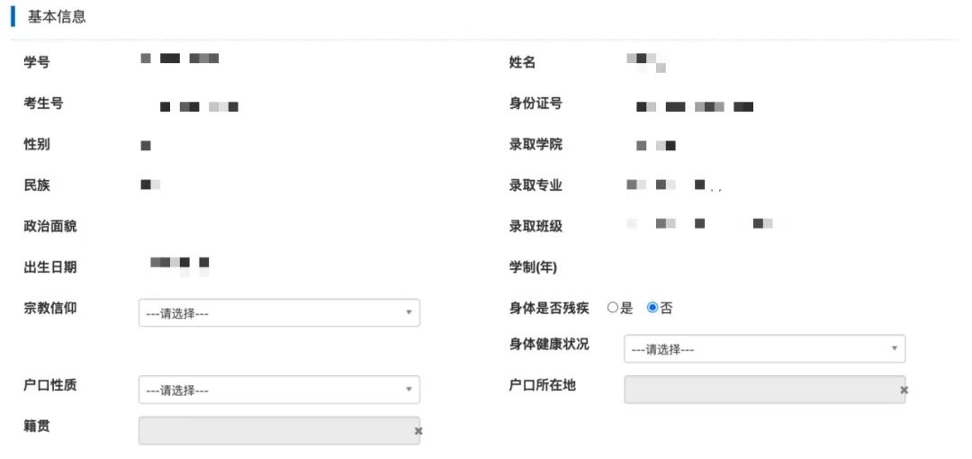 (6)个人信息问卷调查:请新生完善各项信息,其中带红色*标志字段为必填项。