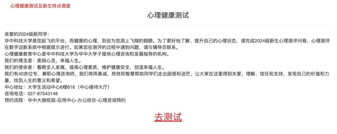 (12)心理健康测试及新生特点调查:心理健康测试将帮助新生更好地了解和提升自己的心理状态,请根据系统提示完成心理测评。