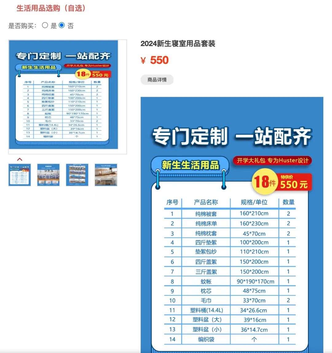 (5)生活用品选购(自选):新生可根据需求自愿选择是否购买生活用品。可点击图片查看商品详情,勾选是否购买,点击确定即可结束商品选购。所选商品费用缴纳可在财务缴费环节一并完成。