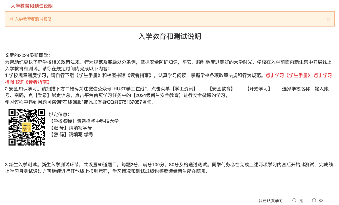 (10)入学教育和测试说明:为帮助新生了解学校相关政策法规、行为规范及奖励处分条例,掌握安全防护知识,平安、顺利地度过美好大学时光,在入学前,学校面向新生集中开展线上入学教育和测试。