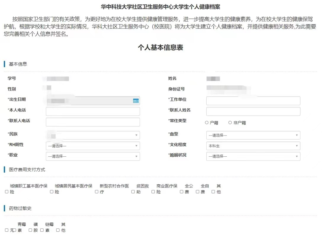 (8)登记健康档案:按照国家卫生部门有关政策,为更好为在校大学生提供健康管理服务,进一步提高大学生健康素养,为在校大学生健康保驾护航,根据学校和大学生实际情况,华科大社区卫生服务中心(校医院)将为大学生建立个人健康档案,并提供健康相关服务,为此需要新生完善相关个人信息。