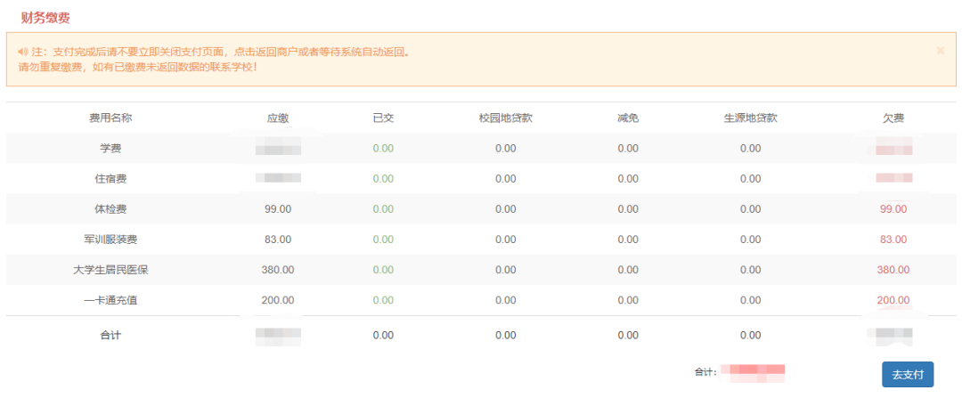 (14)财务缴费:不办理绿色通道的新生,请按照收费标准进行缴费;办理绿色通道且通过审核的新生,可查验应缴总额是否准确,核对无误后点击“去支付”按钮。财务缴费具体操作,可参考本科生数字迎新网“报到服务”栏目中的“财务缴费操作指南”。