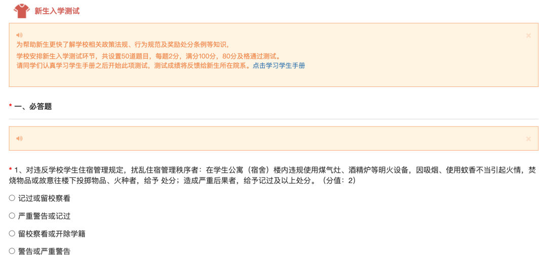 (11)入学测试:入学测试将帮助新生更快了解学校相关政策法规、行为规范及奖励处分条例等知识,共设置50道题目,每题2分,满分100分。80分为通过测试的及格分数。