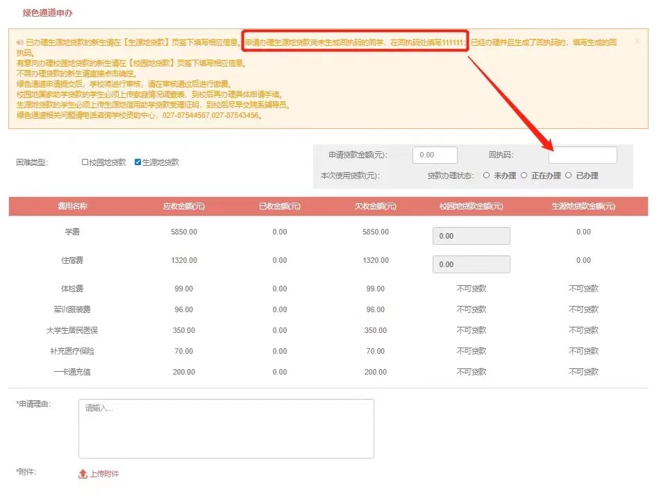(2)绿色通道申办:已经在生源地申请生源地信用贷款的新生,请选择“办理生源地贷款”。申请办理生源地贷款尚未生成回执码的同学,请在回执码处填写111111;已经办理并且生成了回执码的,请填写生成的回执码。填写完信息并上传证明材料后,请等待审批(当天提交当天审结,审批结束前,请勿操作财务缴费环节)。