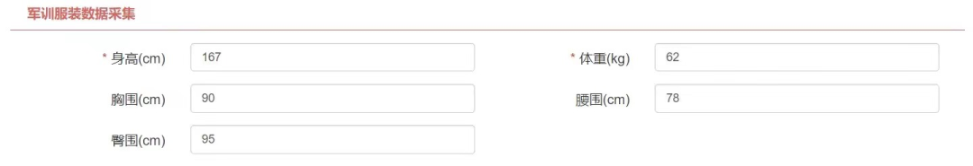 (9)军训服装数据采集:此数据仅供准备军训服装时使用。其中,身高、体重为必填数据,其他为选填数据。