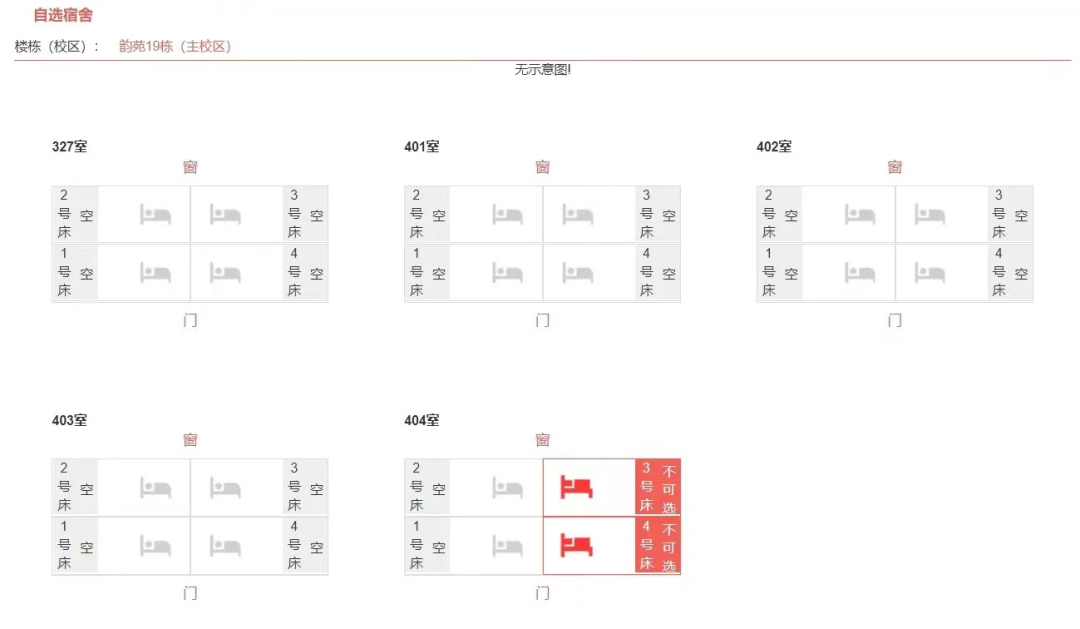 (1)自选宿舍:系统将告知新生所在公寓区及楼栋号码,点击进入即可选择心仪的宿舍及床位。选择完成后,可查询到自己同宿舍其他室友的情况。请新生记下所选宿舍相关信息,以便入校时迅速找到住宿地点。