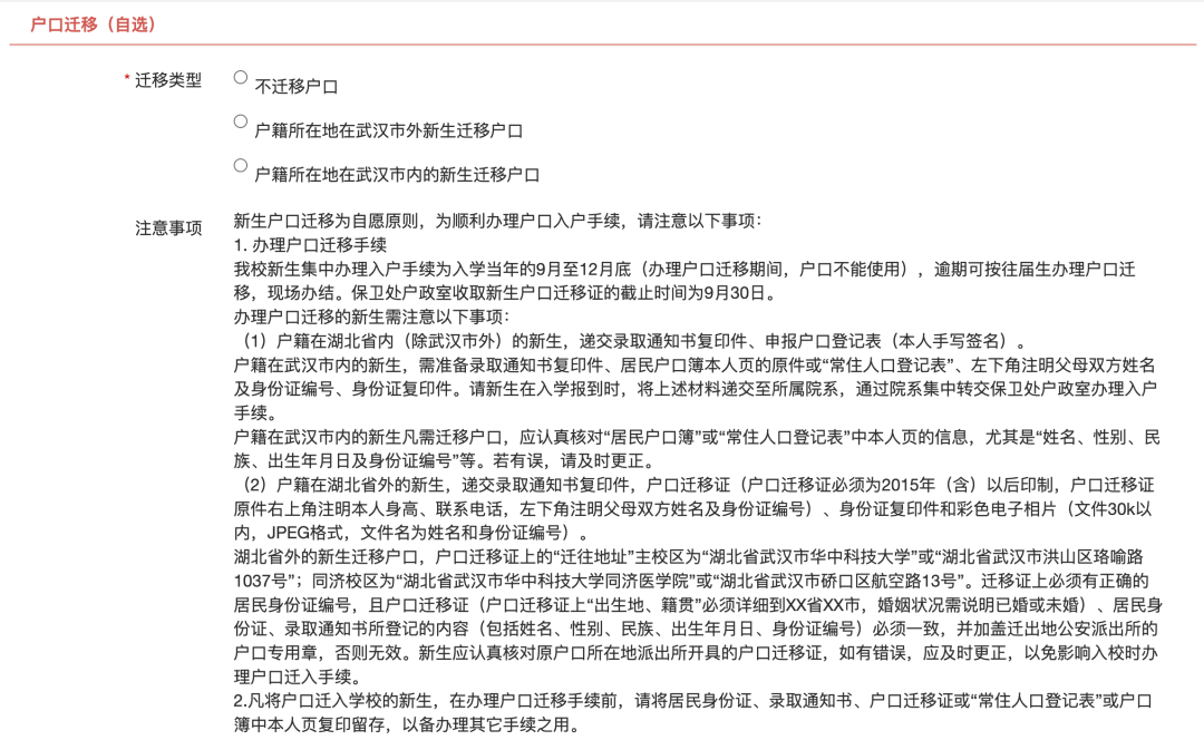 (13)户口迁移(自选):如新生选择将户口迁移至学校,请据实勾选并按照要求准备户口迁移材料;如选择不迁移户口,请勾选“不迁移户口”并点击确定进入下一项流程。