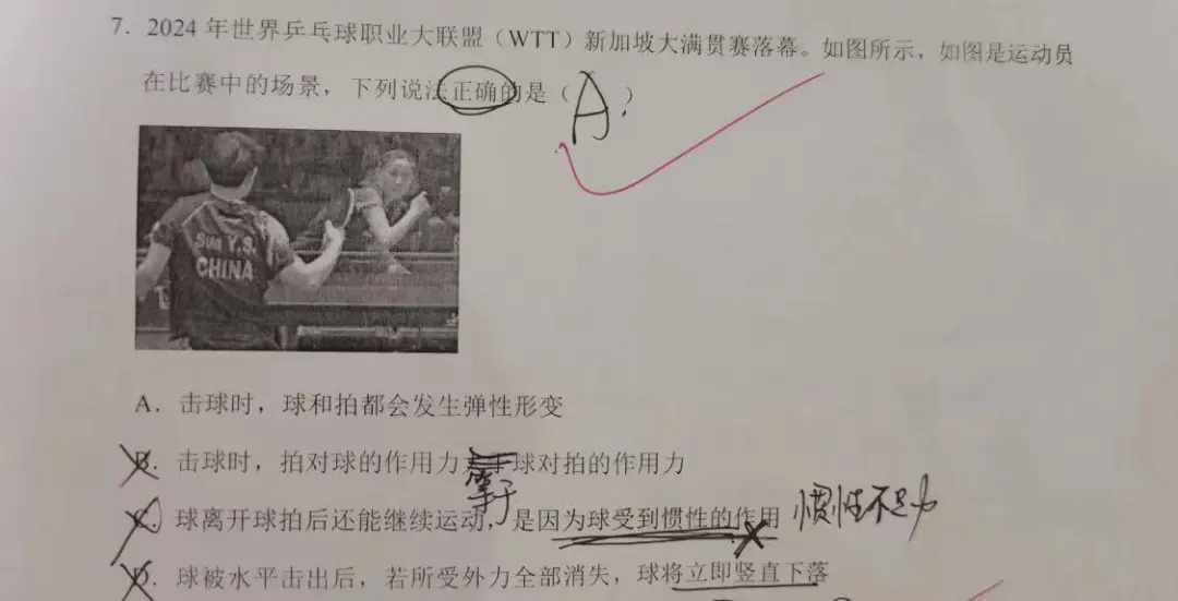此外,乒乓球运动员也曾出现在试卷中。题干写道,“2024年世界乒乓球职业大联盟新加坡大满贯赛落幕,如图是运动员在比赛中的场景,下列说法正确的是……”