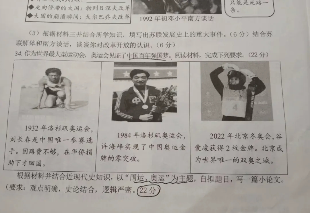 有的出卷老师通过梳理多名运动员的事迹展望我国奥运发展史,要求学生以“国运、奥运”为主题写一篇小论文,增强对中国百年强国梦的认识。