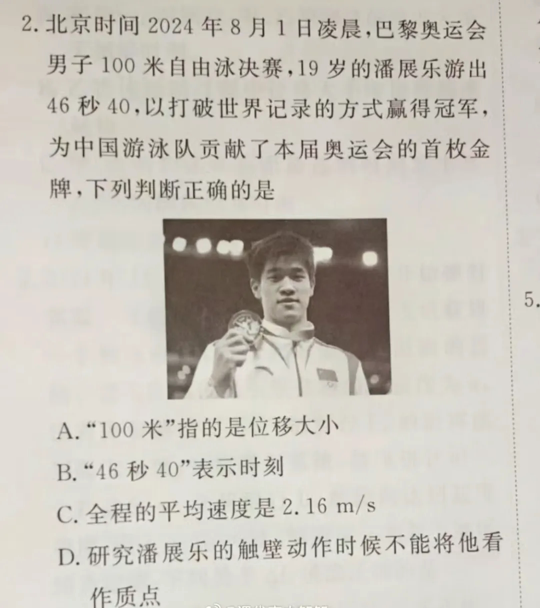 该网友发布的图片中,试卷上赫然有着一道关于“潘展乐巴黎奥运男子100米自由泳夺冠”的题目,题目中先介绍了潘展乐取得的耀眼成绩,随后话锋一转,从“体育”转向了“物理”,考验起了学生的专业知识。