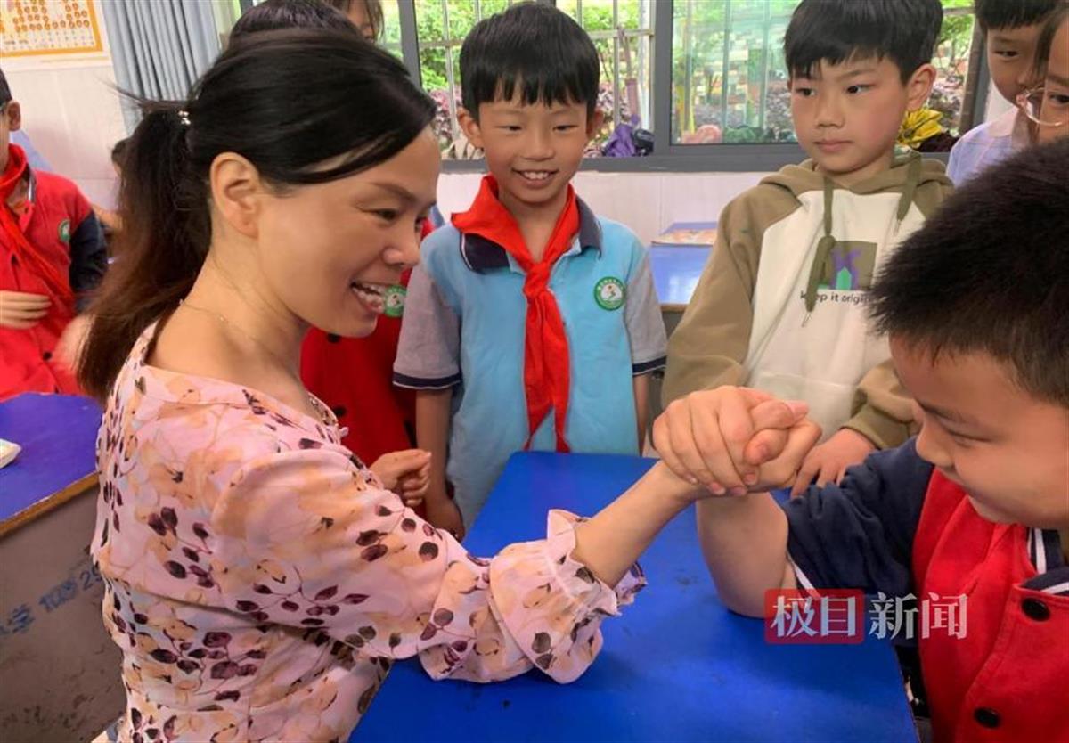 课间洪雄燕和学生掰手腕、玩游戏