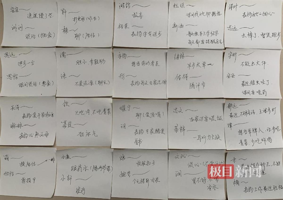 在洪雄燕的办公室抽屉里,整齐地叠放着一沓沓小纸片。每一张都关于学生的点点滴滴:思远有进步给他加一分、宇昕不能出大汗、课间和楠楠谈心……这些看似不起眼的纸片,承载着洪雄燕对学生的深深关爱,数十年来,已攒下了数千张。“写下纸片已经形成了习惯,时间紧要的放在前面,每天来办公室都先翻一翻。”洪雄燕说。