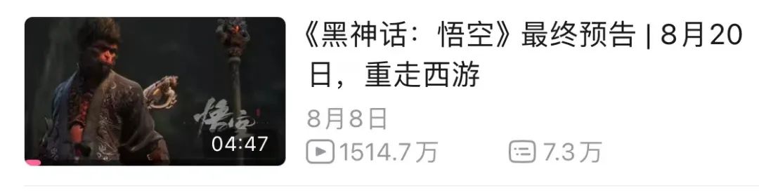 截至8月19日,《黑神话:悟空》最终预告B站播放量达惊人的1514万。而在海外,IGN和Playstation等知名游戏账号在YouTube上同步发布的预告片,总浏览量也达到了14.1万次。